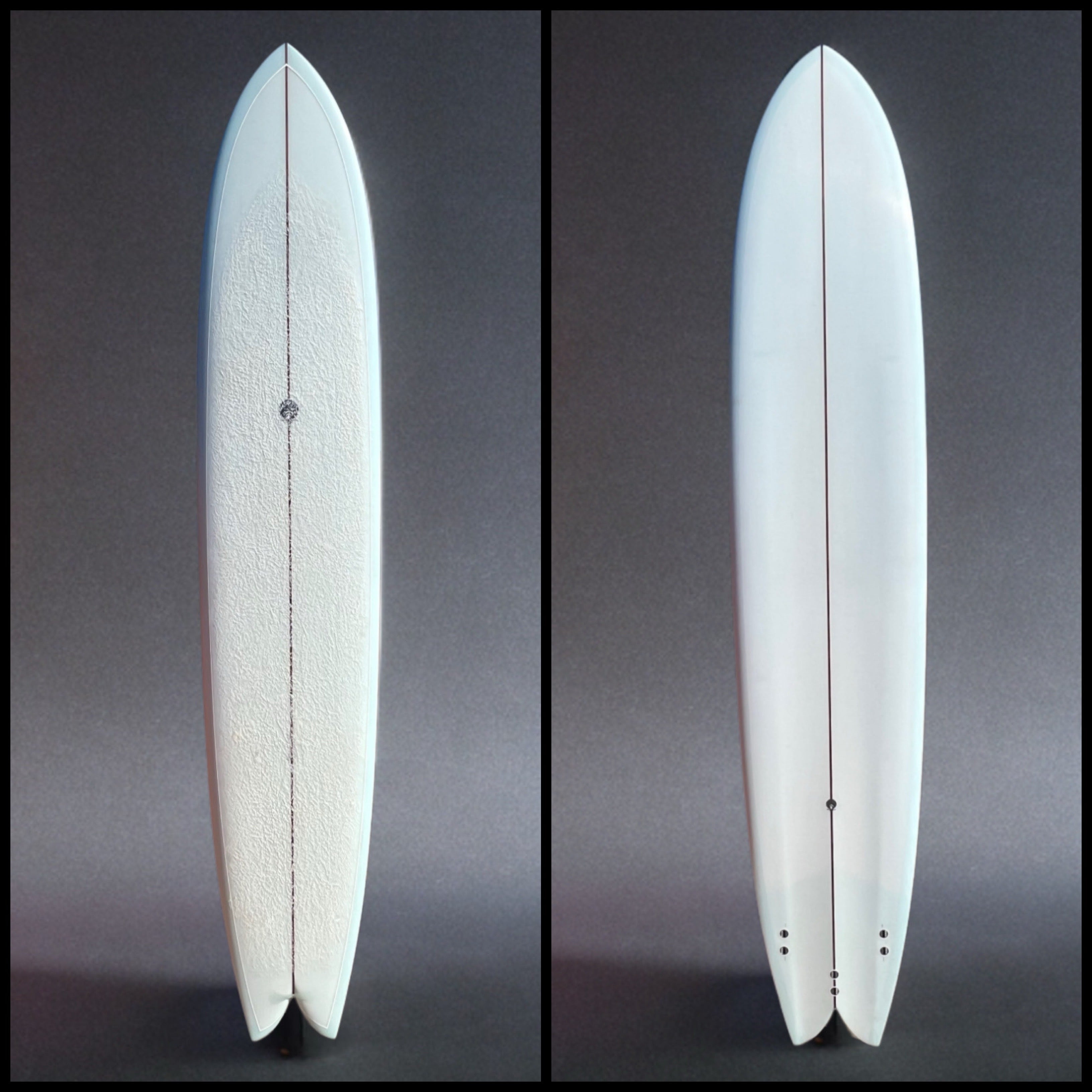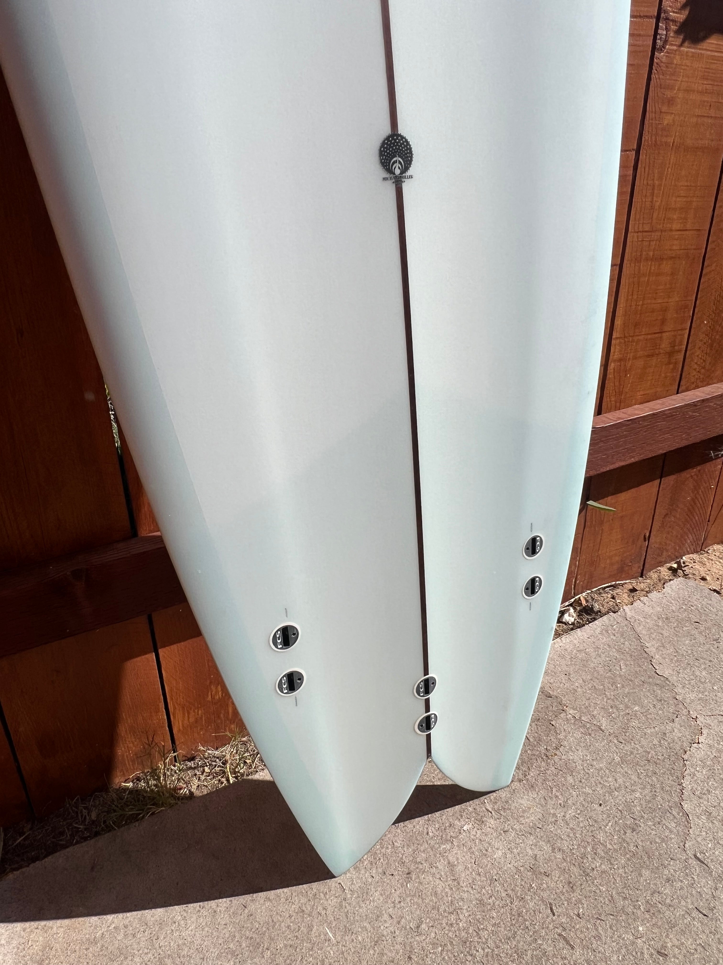 Featuring a subtle ice-blue tint with Larry Crow resin pin-lines, leash loop, wet-sanded gloss(satin) finish and FCS plugs for fin options, this board is the one you’ll grab almost every day around San Diego.