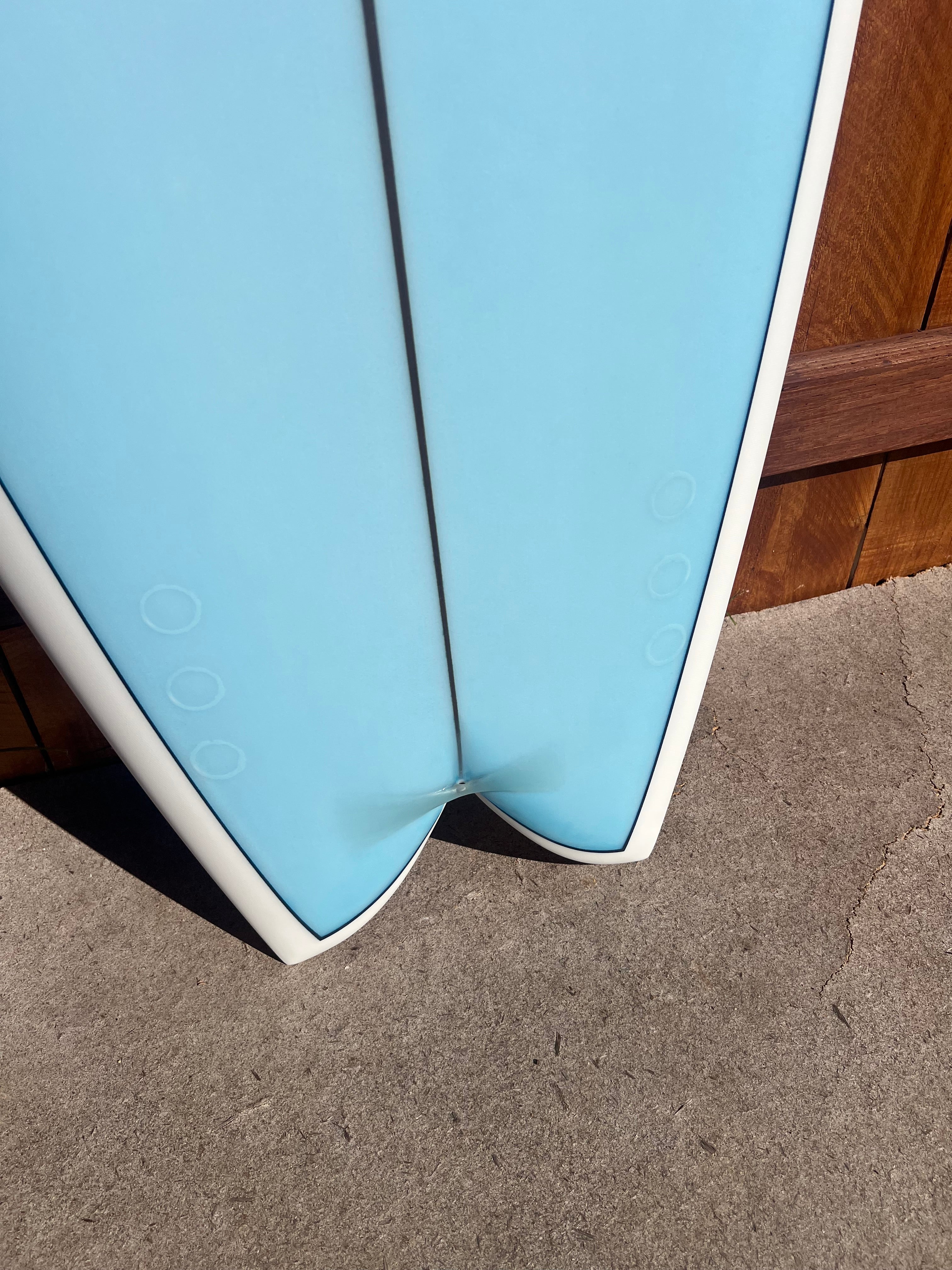 The board is glassed with a 6+6 deck and 6 oz bottom with patch by the fin plugs for added strength. This is a wet-sanded gloss coat, or a "Satin" finish. This gives you the added strength of a gloss but without the high-shine and "slippery in the hands" feeling. It also features a leash loop and a wedge dark wood stinger for added soul and nice flex in the tail. Board was glassed By Super Wolf AKA Alex Villalobos at Custom Surf Glass, one of Californias finest shops.