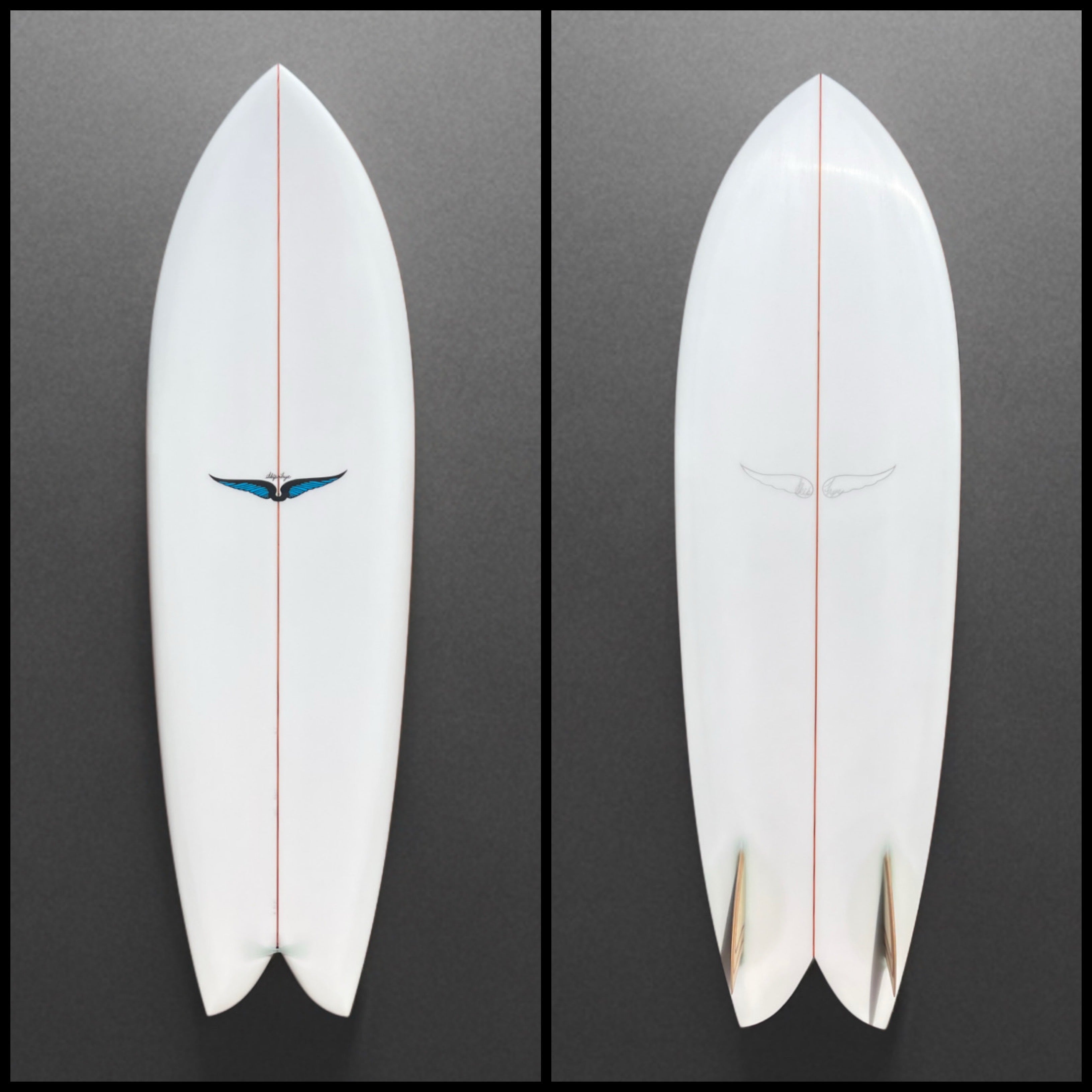 This Clear 6’1” Skip Frye fish with slant-back marine plys by Rick Clow. This board is brand new, just glassed at Custom Surf Glass and looks incredible. The fish is the answer to many who want to go fast, have a board that goes in weak beach breaks and in hollow reefs and can be a board you rode 200 days a year. The fish has proven it merit by the worlds best surfer’s decade after decade and nobody’s been more loyal to the design than Steve Lis and Skip Frye.